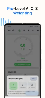 The Decibel Meter: Sound Level Meter app is a useful tool for measuring and monitoring sound levels in your environment. It uses your device's microphone to provide real-time data on sound pressure level (SPL) and helps you understand and manage noise levels. This app is perfect for anyone who wants to ensure a safe and comfortable environment, whether at home, work, events, or outdoors.
