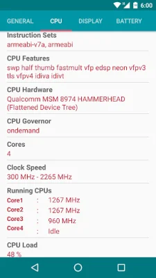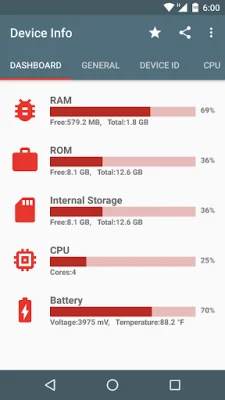 Battery and CPU usage are also displayed in the app, showing information such as battery level, temperature, and usage. Users can also view CPU information such as clock speed, number of cores, and hardware.
