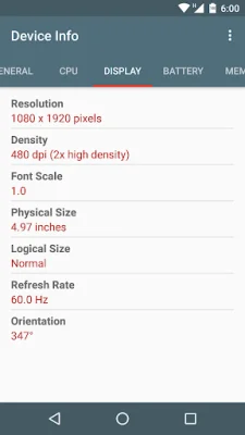 The app also provides detailed display information such as resolution, density, and physical size. This can be useful for users who want to know more about their device's screen specifications.