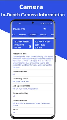 The camera features section provides extensive information about your device's camera capabilities, including its modes, effects, and supported resolutions. You can also view details about your device's network, such as its BSSID, signal strength, and frequency.