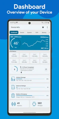 This application is a comprehensive dashboard that provides an overview of all the important information about your device's software and hardware. It includes details such as RAM, internal and external storage, battery health and level, CPU information, available sensors, and installed apps.