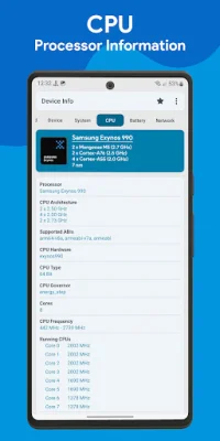 The CPU section displays all the details about the system on chip (SoC), processors, and CPU architecture. It also includes information about the number of cores, CPU frequency, and GPU details.