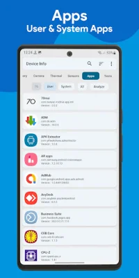 The app section displays detailed information about both user and installed apps, including version, permissions, and activities. The app analyzer feature allows you to analyze your apps using advanced graphs and group them by various criteria.