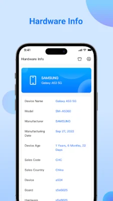 The app's key features include a dashboard that gives an overview of your device's software and hardware information, such as RAM, internal and external storage, battery level, CPU details, available sensors, and installed apps. It also provides specific device information, such as brand, device name, model, manufacturer, manufactured date, age, board, and hardware.