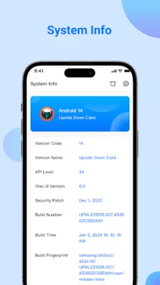 In addition, the app offers system information, including OS version, code name, API level, security patch level, bootloader, build number, baseband, Java VM, kernel, and language. It also displays detailed information about the CPU, such as the system on chip, processors, architecture, supported ABIs, hardware, governor, number of cores, frequency, GPU renderer, vendor, and version.