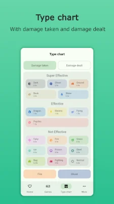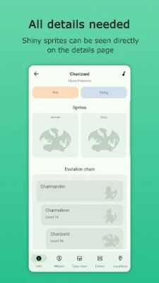 The app also offers shiny sprites directly visible on the details page, making it effortless to see the difference between normal and shiny colors. You can also explore the various forms and evolutions of each monster, and understand their strengths and weaknesses with the comprehensive type chart.
