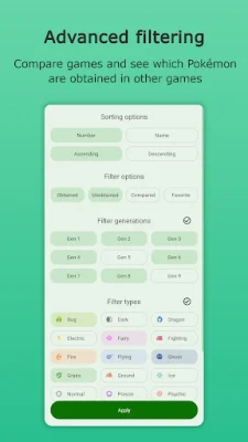 The Dex Tracker app is the ultimate tool for any Pokemon trainer. It offers advanced filtering and searching options, making it effortless to find the exact monster you're looking for. You can easily sort through the vast collection of monsters by type, generation, and more. This makes it a breeze to keep track of your favorite monsters and build your dream team.