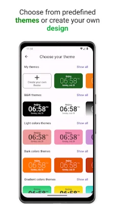 For those who prefer a more precise time display, the app also offers the option to show time including seconds. This can be useful for tasks that require precise timing or for those who simply enjoy seeing the seconds tick by. Additionally, the app allows you to choose from a variety of predefined themes or create your own design. This gives you the freedom to customize the app to your personal preferences.
