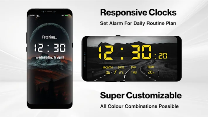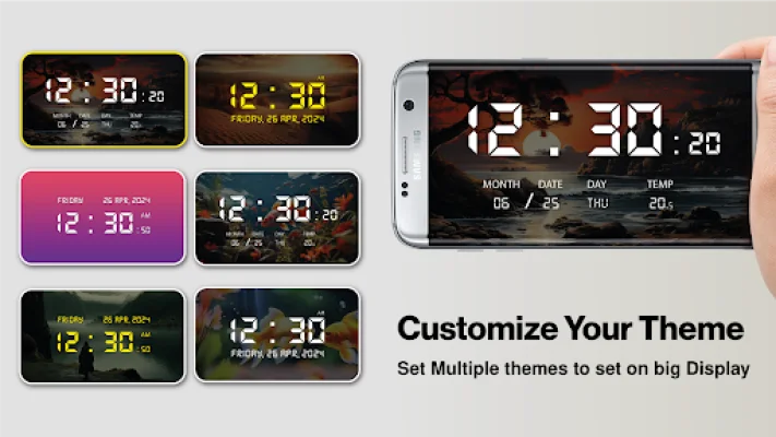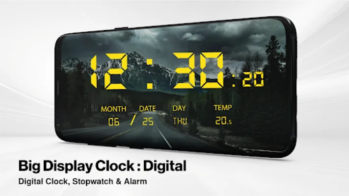 Immerse yourself into a big digital clock that will never let you miss a moment. This app offers a huge digital clock that seamlessly blends into your life, whether you need a night clock or a large LED clock for better visibility. With its big digits, this clock is easily visible from across the room, making it perfect for those who crave clarity and organization. Stay punctual and organized with the alarm clock and timer options provided by this app. Set important notifications and alarms directly from the digital alarm clock, ensuring that you never miss an appointment, meeting, or any other occasion. The big digital clock display and timer app make it easy to keep track of time and stay on schedule. The full-screen display of this big digital clock is incredibly convenient, especially at night when regular wall clocks may not be visible. With the ability to customize the clock to match your unique style, you can choose from a variety of clock themes to make the display truly your own. This digital clock is not only easy to use, but also highly customizable. It offers a dual clock feature for all countries, an always-on display, and a big clock timer and alarm clock. With different unique style clock themes to choose from, you can personalize your clock to suit your taste. Don't miss out on the experience of a huge digital clock - download the Digital Clock Big Display app now. With its user-friendly interface and customizable features, this app is perfect for anyone looking for a reliable and visually appealing way to keep track of time. So why wait? Download now and never miss a moment again.