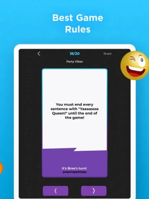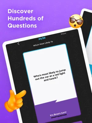 Party Questions! is the ultimate party game that is easy to use and fun at any party. It offers a simple UI design that is easy to navigate and is both fun and addicting for teens and adults. One of the most popular rules players use is coming up with acts that must be performed based on the color of their card being blue or purple.