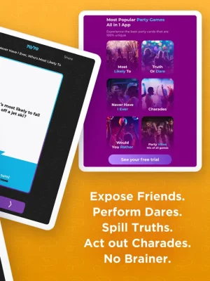 Play our Premier Party Game Pack "Whos Most Likely To" along with bonus packs of Truth or Dare, Never Have I Ever, Would You Rather, Charades & more! This app is perfect for any party with adults, offering a variety of house party games and party favorites. With the option to play 20 question rounds and the ability to keep going for even more questions, this app is sure to provide endless entertainment for your next gathering.