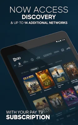 Discovery GO is an application that allows you to link your pay TV provider, such as cable, satellite, telco, or live TV streaming service, to access a variety of popular shows from the Discovery network and other networks. This includes shows like Gold Rush, Moonshiners, Bering Sea Gold, Deadliest Catch, Battle Bots, Street Outlaws, Naked and Afraid, Naked and Afraid XL, Expedition Unknown, and Alaska: The Last Frontier, as well as top shows from other networks like HGTV, Food Network, TLC, ID, and Travel Channel. The app also offers the convenience of new episodes being available the same day as they premiere on TV.