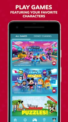 The app also features a collection of games and activities, featuring popular Disney characters, such as puzzles and racing games. These games are a fun way for users to engage with their favorite shows and characters.