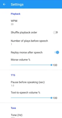 The app also offers a shuffle playback option, which adds an element of randomness to the practice sets. This can help users improve their ability to recognize and interpret Morse code in different contexts. Additionally, users can choose the number of CW repeats before speech, allowing them to focus on specific phrases or words.