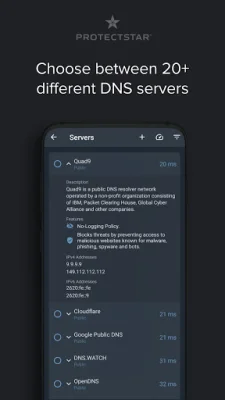 The app offers a variety of preconfigured DNS servers to choose from, including options focused on security, ad blocking, parental control, and malware protection. These specialized servers can help protect users from phishing, malware, ransomware, and other malicious domains.