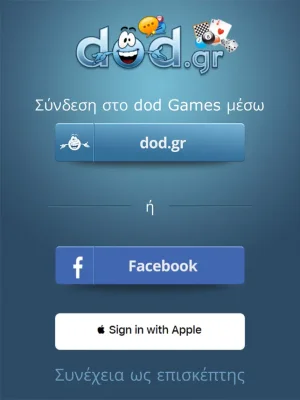 Η σύνδεση και το ξεκίνημα στο "dod Games" είναι εύκολα και γρήγορα. Μπορείτε να συνδεθείτε μέσω του λογαριασμού σας στο dod, στο Facebook ή στο Apple. Επιπλέον, μπορείτε να δημιουργήσετε ένα νέο λογαριασμό με ένα κλικ μέσω του κουμπιού "dod.gr - Νέος Χρήστης". Αν δεν θέλετε να δημιουργήσετε λογαριασμό, μπορείτε να εξερευνήσετε την εφαρμογή ως επισκέπτης και να απολαύσετε λειτουργίες που δεν χρειάζονται λογαριασμό.