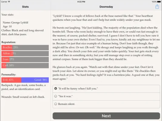 As you navigate through the novel, you will face deadly enemies, ranging from humans to mutants. Each encounter will test your skills and force you to adapt to the ever-present danger that lurks around every corner. But it's not just about survival. You will also have to make tough decisions about who to trust. Will you build and strengthen friendships, or will you make enemies along the way?