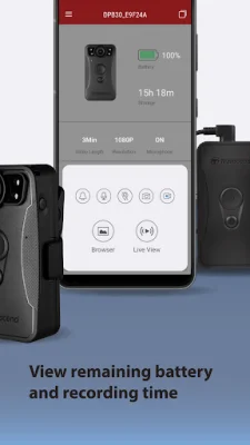 The app's home screen displays the remaining battery and recording time of the DrivePro Body camera, providing users with important information at a glance. The Live View feature allows for real-time viewing of footage recorded by the camera on a mobile device. This can be useful for monitoring footage as it is being recorded.