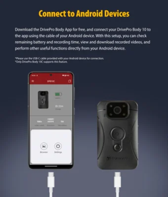 For those who prefer to use a Wear OS smartwatch, the DrivePro Body app also offers the ability to connect to the camera device. This allows for quick setup and access to device information directly from the smartwatch. The app is compatible with a variety of DrivePro Body models, including the 10C, 10D, 30, 40, 60, 70, 20, and 52. For Wear OS, it is compatible with the 30, 40, and 70 models.