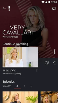 The app offers various ways to watch content, including the ability to watch the latest episodes of new E! shows the day after they air on TV, live stream and schedule available 24/7 when signed in with a TV provider, and the option to Chromecast episodes to a TV. The app also saves the user's place in an episode, allowing them to resume watching later. Users can also mark shows as their favorites for quick access to the latest episodes.