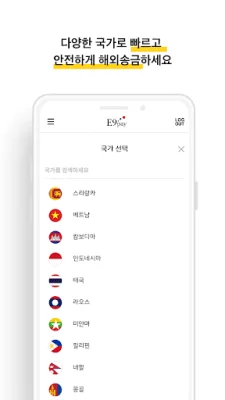 E9PAY는 금융결제원을 통해 안전한 해외송금을 제공하며, 각 나라별로 믿을 수 있는 은행으로만 송금이 가능합니다. 또한 금융감독원과 한국은행이 직접 감독하여 더욱 안전한 서비스를 제공합니다. 현재는 네팔, 베트남, 필리핀, 인도네시아, 태국, 캄보디아, 스리랑카, 방글라데시, 중국, 말레이시아, 몽골, 러시아, 우즈베키스탄, 키르기스스탄, 카자흐스탄, 파키스탄, 인도, 호주, 일본, 타지키스탄 등 다양한 국가로 송금이 가능하며, 미국 지원 예정입니다.