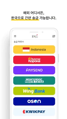 E9PAY는 해외송금 서비스를 제공하는 앱으로, 쉽고 빠르며 안전하고 저렴한 송금을 할 수 있도록 도와주는 앱입니다. 이 앱을 사용하면 환전 수수료, 전신료, 중계은행 수수료, 수취은행 수수료 등이 없어서 더욱 편리하게 해외송금을 할 수 있습니다. E9PAY는 은행 방문이나 공인인증서가 필요하지 않고, 앱 접근성 서비스 API를 사용하여 오류 발생 시 화면 공유 솔루션을 통해 사용자의 편의를 증대시킵니다.