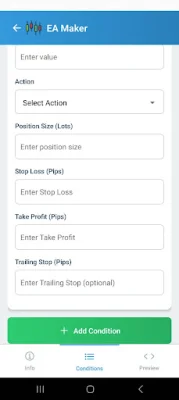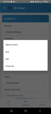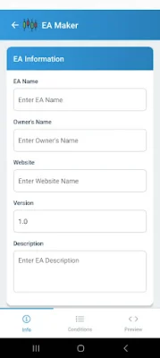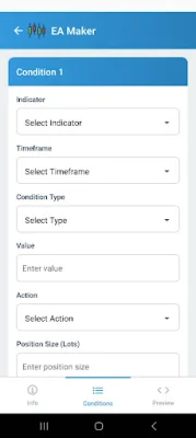 With our mobile application, you can easily design Expert Advisors (EAs) for your trading needs. The interface is simple and user-friendly, making it accessible for all traders. You can select indicators, set conditions, and build your strategies effortlessly, without the need for any coding knowledge. This allows you to focus on your trading strategy rather than worrying about the technical aspects of coding.
