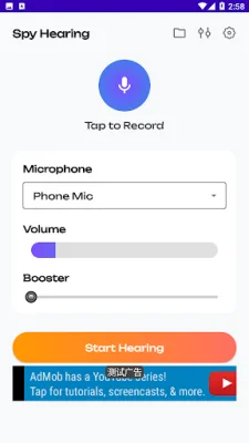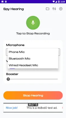 This application, called Ear Spy: Hearing Booster, is a sound amplifier that allows you to adjust the volume and boost the sound. It offers multiple microphone options, including phone, Bluetooth, and headset, making it versatile for different listening situations. With just one tap, you can easily record and playback audio. The app also features an equalizer with bass, virtualizer, and presets to customize your sound experience. It is ad-supported, lightweight, and has a simple user interface for easy navigation.