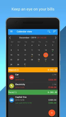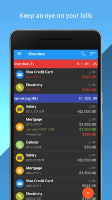 The app offers different views for bills, including an overview, overdue, paid, monthly, calendar, and custom view. Users can make partial or full payments and the app keeps track of payment history for each bill. It also allows for different date formats and currencies to accommodate users from different regions. Users can also backup and restore their data to Google Drive or locally, and there is an option for auto-backup to Google Drive.