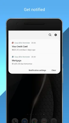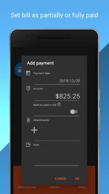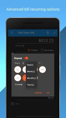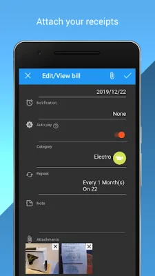 This application is designed to help users keep track of their bills and payments. It sends daily notifications until the user dismisses them or marks the bill as paid, regardless of whether the app is open or closed or if the device has been restarted. The app offers advanced repeating options, including the ability to set an end date or number of repetitions. The notifications are displayed on the notifications bar and the app has both dark and light modes for user preference.