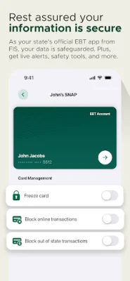 Not only does ebtEDGE help you manage your benefits, but it also prioritizes the safety of your money. Our app is the official app from your state's EBT processor, FIS, and allows you to lock and unlock your cards anytime. You can also report lost, stolen, or damaged cards and have the peace of mind of secure login and Face ID. Plus, you'll receive alerts when your card is used or if there are any changes to your security credentials.