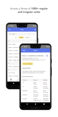 Some of the features of Ella Verbs include 30 levels (6 for free) and 8 milestones (2 for free) with bite-sized lessons and quizzes to guide you through 16 tenses and master Spanish verb conjugation. You'll also have access to verb tables with over 2,300 verbs (101 for free), complete with English translations, synonyms, and highlighting of irregular verbs. You can even search for verbs by conjugation.