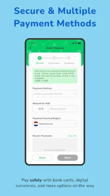 For added convenience, users can buy Green Credits (GCR) within the app and use them for all transactions. This eliminates the need to constantly add money for each individual transaction. Plus, users can earn Green Points (GPT) for actions and transactions made within the app, which can be converted to GCR or used for rewards such as mobile top-up discounts and free greeting cards.