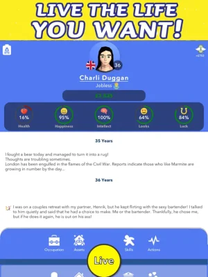 With this charming and witty human life simulator, you have the freedom to explore all the possibilities of living. Will you make all the right choices and create the best life for yourself and your family? Drive your car and discover the city, build relationships according to your desires, and fully immerse yourself in this real-life simulator. The power is in your hands to make your life beautiful or mess it up. Discover the best way to live in this living simulator and fulfill your dreams.