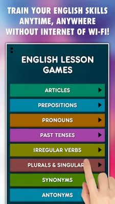 Welcome to our English Grammar Games app! With our app, you can improve your English language skills in a fun and challenging way. Whether you want to challenge yourself with a test or practice your skills, our app has got you covered. And the best part? You can play offline, anytime and anywhere, without the need for internet or Wi-Fi! Our app is perfect for learners of all ages, with no ads, in-app purchases, or subscriptions. You can learn at your own pace, without any interruptions. And with 10 diverse and engaging games, you can master key English concepts while having fun. Track your progress and compare your scores with others on our global and local leaderboards. See how you rank against learners worldwide and stay motivated to improve. You can also choose between structured testing or relaxed practice, depending on your learning style. Our app includes games for various English concepts such as articles, irregular verbs, past tenses, plurals and singulars, prepositions, present tenses, pronouns, synonyms and antonyms, conditionals, and phrasal verbs. With different game modes and hundreds of examples, you can expand your vocabulary and improve your grammar skills. So why wait? Download English Grammar Games now and unlock a world of learning! With our app, learning has never been more fun and convenient. Be a star in your English lesson and challenge yourself to become the best. Try it out today!