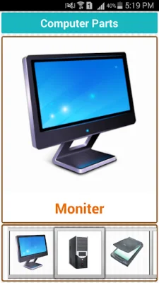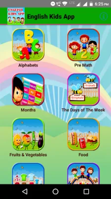 This app is designed for school kids to learn English and basic concepts of mathematics in a fun and interactive way. It includes various sections such as English Alphabets, Kids Pre Math, Kids Math, English Numbers, English Months, The Days of the Week, Fruits & Vegetables in English, Food, Clothes, Flowers, Vehicle, Birds, Animals, Colors, Shapes, Occupations, Computer, Seasons of the Year, School Stationery, Good Habits for Kids, Magic Slate, and Directions. Each section contains pictures and words with accompanying sounds to help kids learn how to pronounce them correctly.