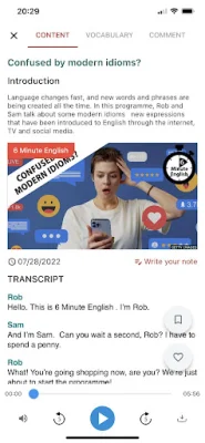 This is a free application designed to help users learn and improve their English skills. It offers various features such as English listening, grammar, vocabulary, and more. The English Listening - 6mins program is a great way to enhance your English skills in just six minutes a day.