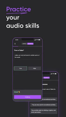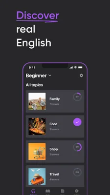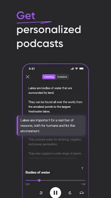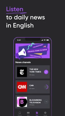 The main features of the app include a test to determine the user's English level (beginner, intermediate, or advanced), an interface available in 10 languages, audiobooks with customizable font and background colors, and world news in English from sources like BBC News. The English podcasts are organized by topic and range in length from a few minutes to 6 minutes or more. Each listening lesson also includes an illuminated transcript to help users follow along and not miss any words. Users can also save new vocabulary words for further study and take tests to assess their understanding of news stories, podcasts, or audiobooks.
