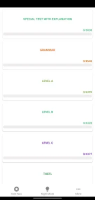 The app offers different levels of exercises, including Level A, B, and C, each with more than 1,500 multiple-choice exercises. These exercises cover a wide range of topics and grammar structures, making it a comprehensive tool for English learners. Additionally, there are also specific exercises for TOEFL and TOEIC, two popular English proficiency tests, with over 1,000 multiple-choice exercises each.