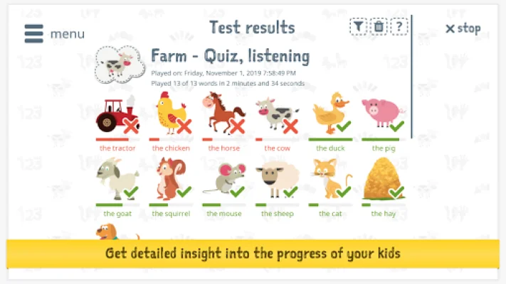 The app also allows parents and supervisors to view their child's progress in the listening and reading skills section, with the option to filter by category and skill. This feature is available for a limited time, but can be extended through an in-app purchase to view results from the last two weeks.