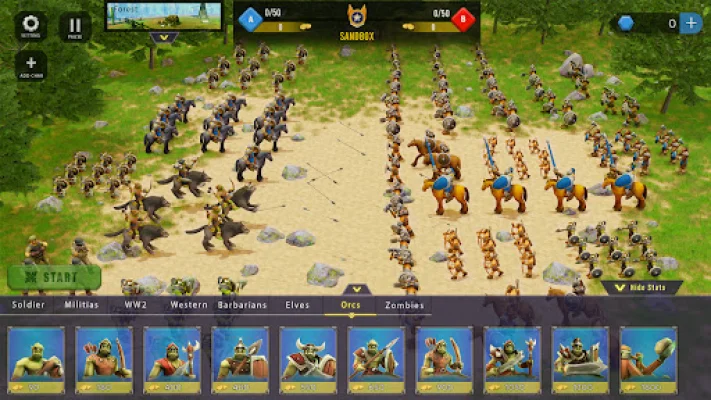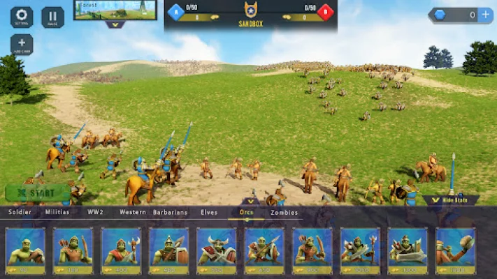 Epic War Simulator - WW2 Battle Strategy Games offers two game modes - Sandbox and Campaign. In Sandbox mode, the possibilities are endless, allowing you to create your own scenarios and battles. In Campaign mode, you will follow a specific storyline and complete missions to progress in the game. The game also features smart AI troops, making the battles more challenging and realistic.