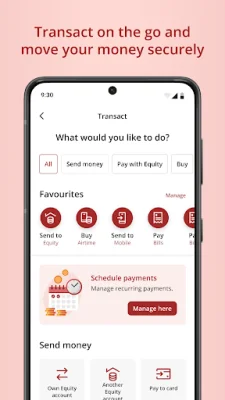 Equity mobile also offers the convenience of paying for various services and goods directly through the app. You can pay your bills, purchase goods, and even pay at M-PESA tills. Additionally, you can save your favorite people and businesses to a list for quick and easy access.