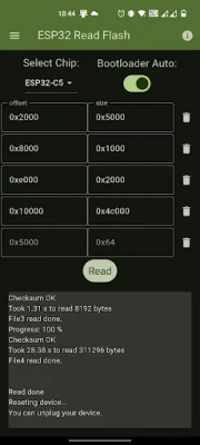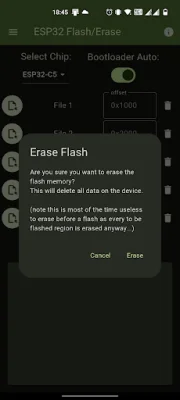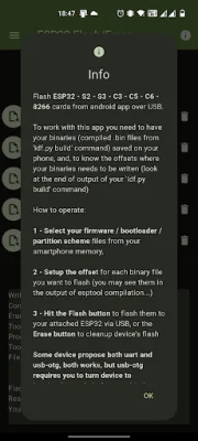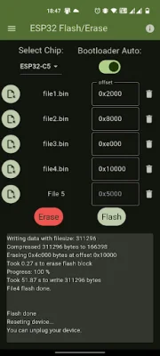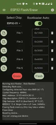 This application is a Serial Monitor that allows users to view both text and plot data. It is designed to be used with various devices, and users can select their specific device from a list. If the device does not support Bootloader auto mode, this feature can be disabled. Users can then browse and select firmware, bootloader, and partition scheme files from their smartphone's memory. They can also set the offset for each binary file they want to flash, which can be found in the output of esptool compilation. To use the application, users must put their device into Bootloader mode using the BOOT-RST buttons. Once the device is in Bootloader mode, users can hit the flash/erase button to flash the selected files to their attached ESP32/ESP8266/ESP32S2/ESP32S3/ESP32C3/ESP32C5/ESP32C6 via USB. If needed, users can cancel the operation before it begins, but they may need to wait for the procedure to completely cancel. The application has been tested on various devices, including ESP32 WROOM32, ESP8266 miniD1, ESP32S2, ESP32S3, ESP32C3, ESP32C5, and ESP32C6. It is also recommended to check out the developer's other app, ESP32NetworkToolbox, which utilizes this feature. The developer encourages users to be original and SEO-oriented when using this app.