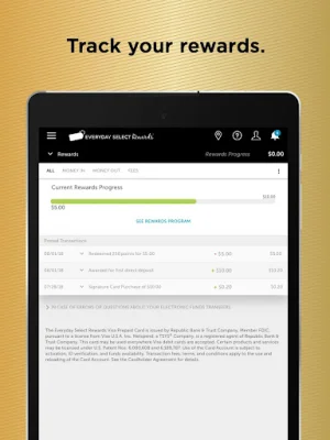 The Everyday Select Rewards Visa Prepaid Card is issued by Republic Bank & Trust Company and is accepted wherever Visa debit cards are accepted. Netspend, a registered agent of Republic Bank & Trust Company, offers certain products and services that may be licensed under U.S. Patent Nos. 6,000,608 and 6,189,787. The use of the card account is subject to activation, ID verification, and funds availability. Users should also be aware of transaction fees, terms, and conditions that apply to the use and reloading of the card account. For more information, users can refer to the cardholder agreement. Overall, this app offers a convenient and secure way to manage a prepaid card account on-the-go.
