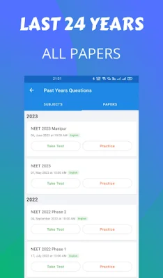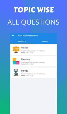 This application provides a platform for students to practice and take mock tests on previous years' questions of NEET, a competitive medical entrance exam in India. It allows students to assess their performance and prepare for the exam effectively. The application covers all the chapters in the Biology, Physics, and Chemistry subjects, providing a comprehensive study material for students.