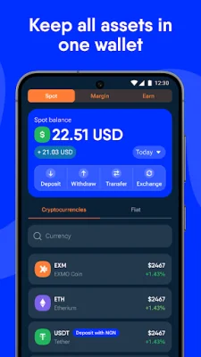 EXMO.com is a mobile application that allows users to access advanced trading features for buying and selling cryptocurrency. The app supports various order types, including market, stop, and limit orders, and provides real-time tracking of BTC and other crypto rates through interactive charts. Users can also monitor their trades through the order book and transaction history. In addition to trading, the app also serves as a secure wallet for storing assets. It supports dozens of popular crypto assets, as well as fiat currencies, and utilizes LedgerVault technology for 24/7 protection. Users can also use the app's unrealized PnL feature to compare current and original purchase prices of their crypto assets to determine potential gains or losses. The app also offers features for discovering profitable coins and staying updated on market trends. Users can view their earnings over a specific period and compare the revenue generated by different cryptocurrencies. They can also set price alerts to receive notifications when a crypto's price reaches a desired level. The "Compare Markets" feature allows users to quickly check trading pairs for each asset. EXMO.com also provides 24/7 support through a chat feature within the app. Users can easily contact the support team for assistance without filling out lengthy forms or waiting for hours. The app also has a chat feature for traders to connect and share insights and experiences. The app offers multiple benefits, including top-tier fund protection through custodial providers, multiple deposit options, and low trading fees. Users can easily top up their balance with Visa/Mastercard or bank transfers and trade in over 90 crypto pairs with a low fee of 0.1%. They can also earn yield on stablecoins through the app's Earn program. Additionally, users can receive up to 100% trading fee discounts with EXMO Premium packages. Overall, EXMO.com is a user-friendly mobile app that provides a convenient and secure platform for trading and storing cryptocurrency. With its advanced features and competitive benefits, it is a top choice for those looking to enter the world of crypto trading.