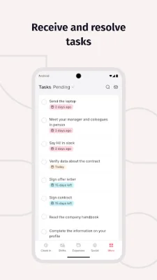 The app also offers an expenses feature, allowing you to quickly submit your expenses by taking a photo of your receipt. You can also monitor the approval process for your expenses directly within the app.