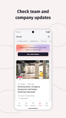 The app also has a social aspect, allowing you to access valuable company information such as news, events, new joiners, and birthdays. This helps you stay connected with your coworkers and stay informed about important company updates.