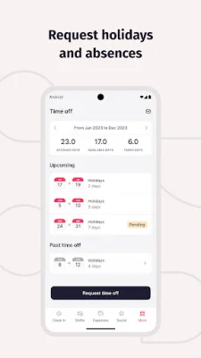 In addition to tracking your attendance, Clock in also offers absence management features. You can effortlessly request holidays, medical leave, and personal leave through the app. Once you submit your request, you will receive prompt notifications upon manager approval. Team managers can also use the app to approve or reject these requests.