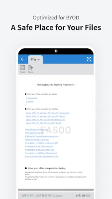 Fasoo DRM supports a variety of file applications, including MS Word, PowerPoint, and Excel, as well as Arae-A Hangul, Adobe PDF, text files, and various image files. This wide range of supported file types makes it a versatile and comprehensive security solution for any workplace.